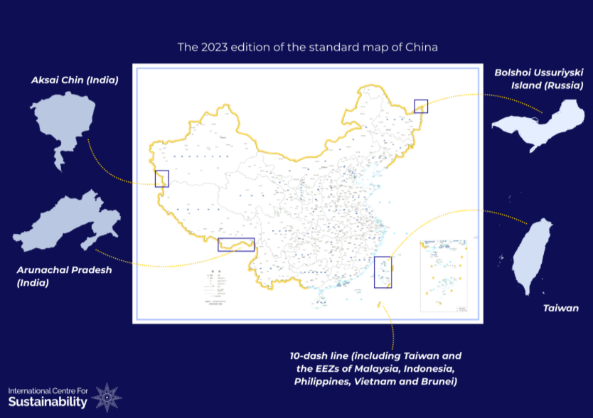 Figure 1 : The standard map released by China in 2023, claiming maritime zones and territories belonging to several countries as its own.
